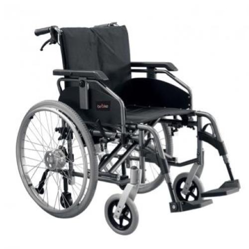 Carrozzina ad autospinta con telaio pieghevole in alluminio a doppia crociera,disponibile in 6 varianti di misura, da 38, 40, 43, 45 ,48, 51 cm, dotata di freni a tamburo con leve per accompagnatore.