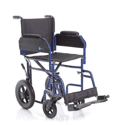 Ruote anteriori in PU (Ų 18 cm) con forcella in plastica. Pedane estraibili, regolabili in lunghezza con pedana in plastica nera e cinturino ferma-polpaccio.
