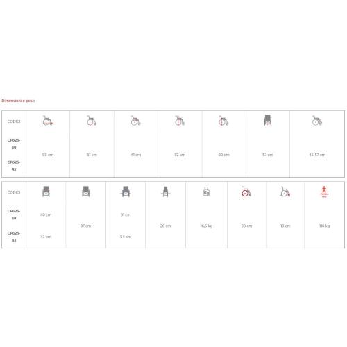 Ruote posteriori piene in PU (Ų 30 cm), posizionate sotto la seduta per ridurre gli ingombri laterali e semplificare lattraversamento dei passaggi stretti, doppio foro per essere trasformata in modello ad autospinta (kit optional).
